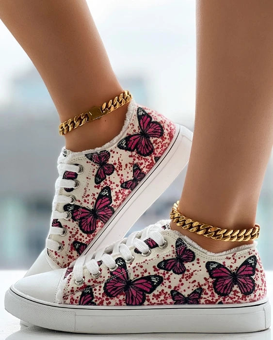 Women's Sneaker 2025 Spring New Butterfly Print Hem Eyelet Lace-Up Sneakers Casual Daily Round Toe Flat Sneakers