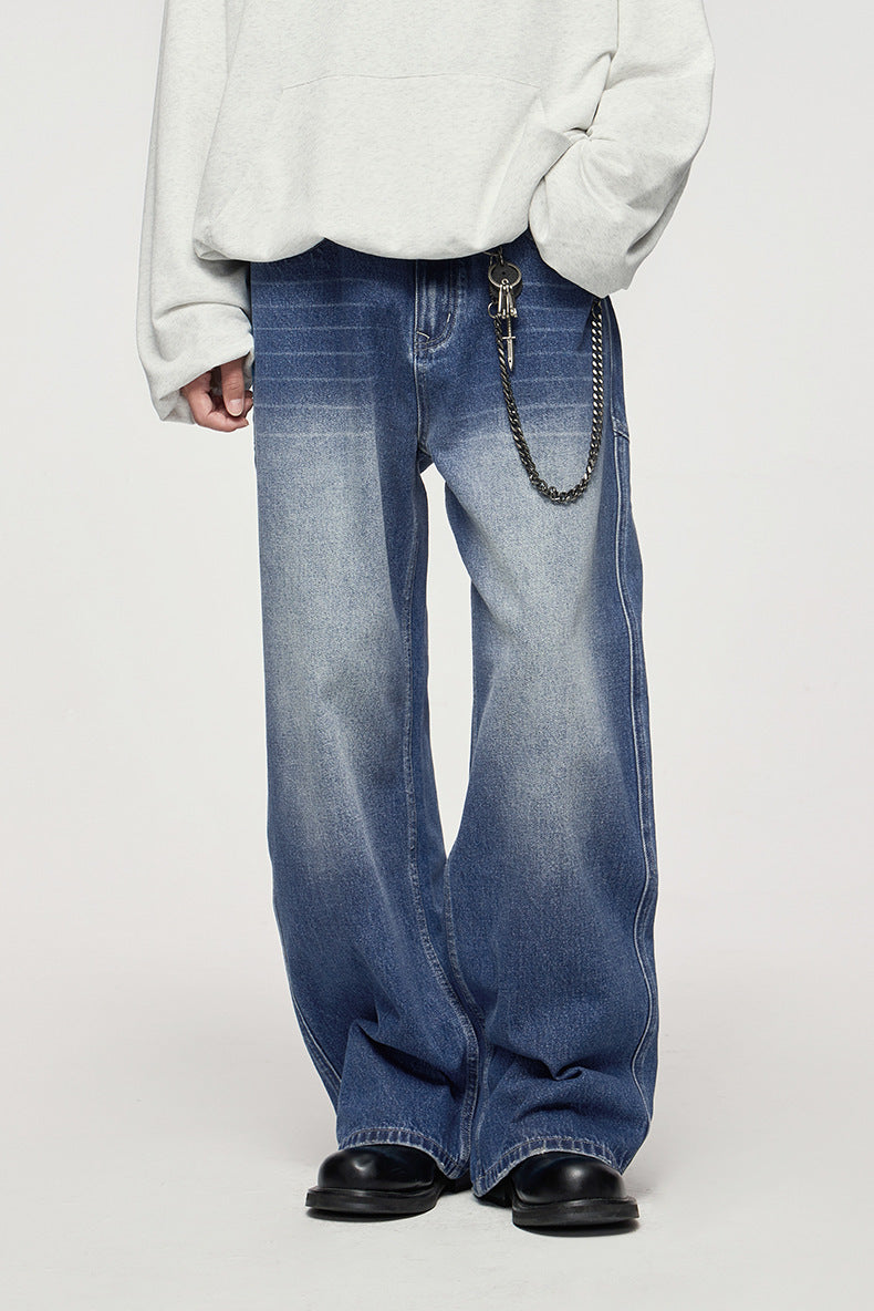 Men's Washed Blue 3D Cut Wide Leg Jeans