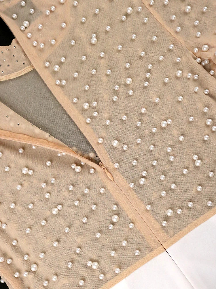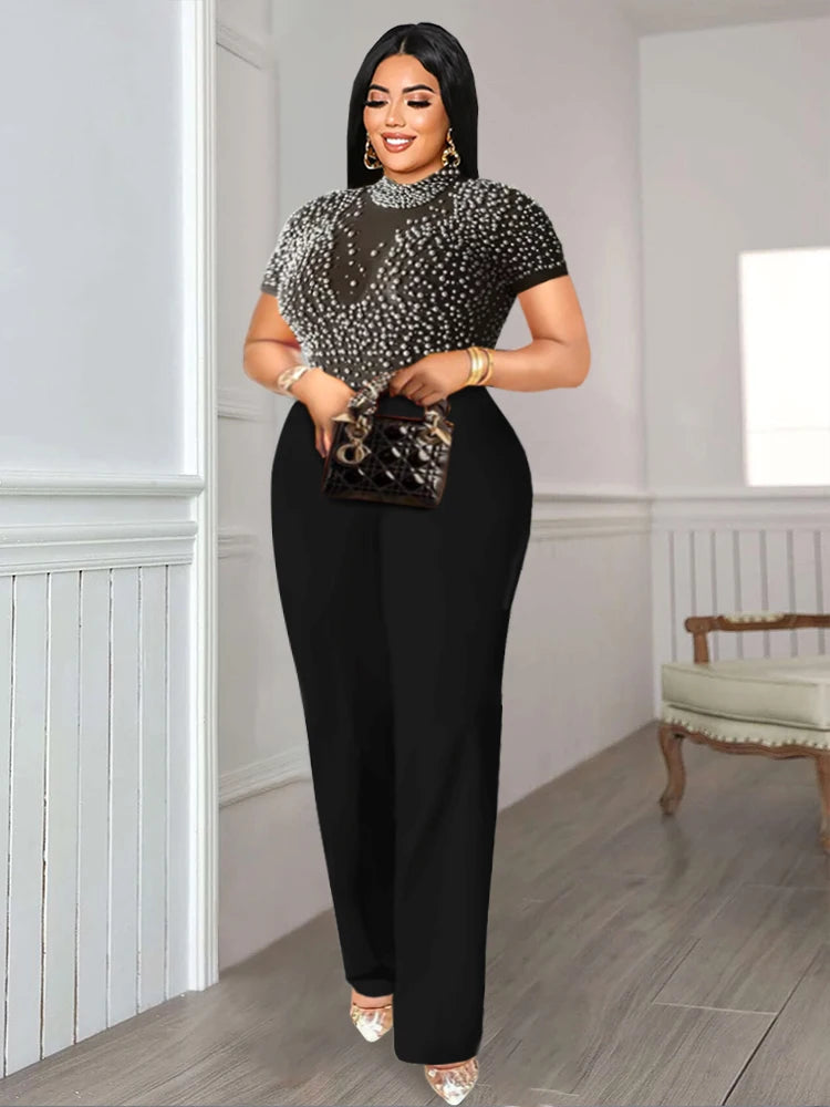 Plus Size Jumpsuits for Women See Through Beading Long Sleeve Beige Black Empire Wide Leg One Piece Outfits Luxury Rompers