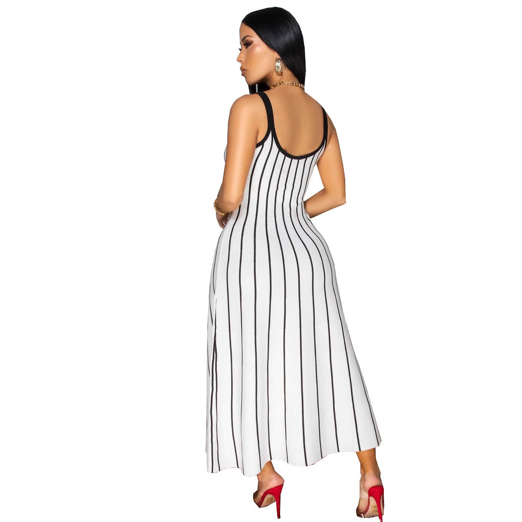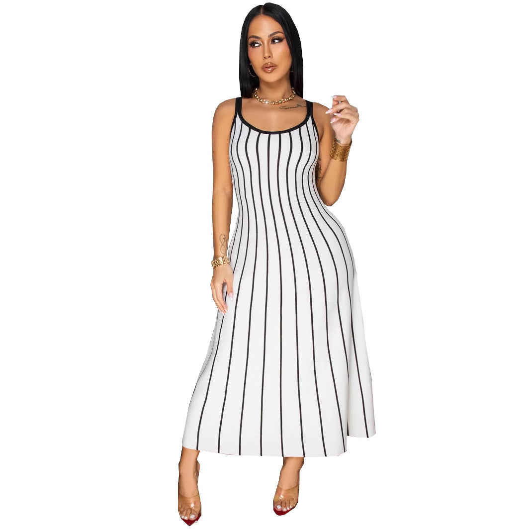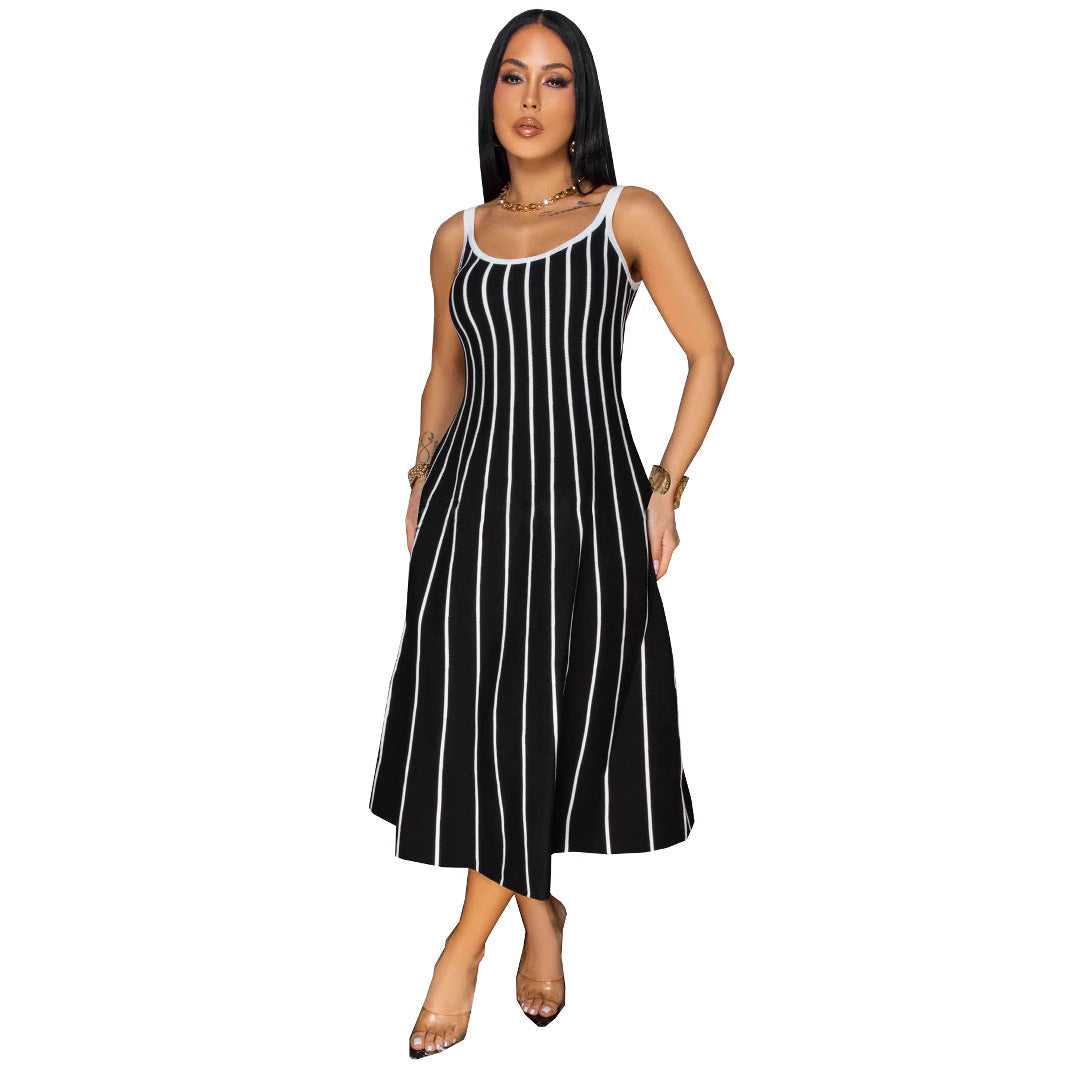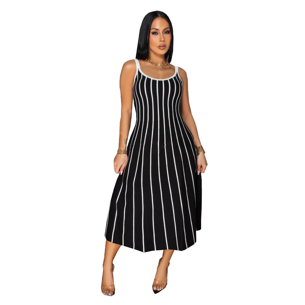 Retro Spaghetti Straps Striped Stitching Dress