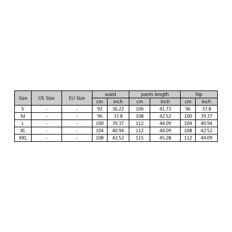 Size: S, Waist: 92cm; pants length: 106cm; hip: 96cm Size: M, Waist: 96cm; pants length: 108cm; hip: 100cm Size: L, Waist: 100cm; pants length: 110cm; hip: 104cm Size: XL, Waist: 104cm; pants length: 112cm; hip: 108cm Size: XXL, Waist: 108cm; pants length: 115cm; hip: 112cm
